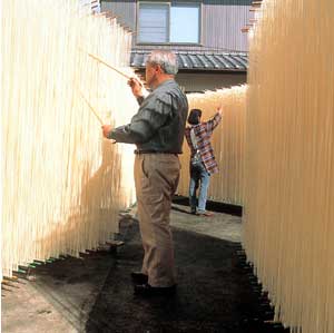 吉野川の地下水と阿讃山脈から吹き下ろす寒風が育んだ半田そうめんは、普通のそうめんに比べて太いのが特徴です。そのため適度な歯応えが楽しめ、冷やしはもちろん、温かいにゅうめんにしても美味しいと評判です。