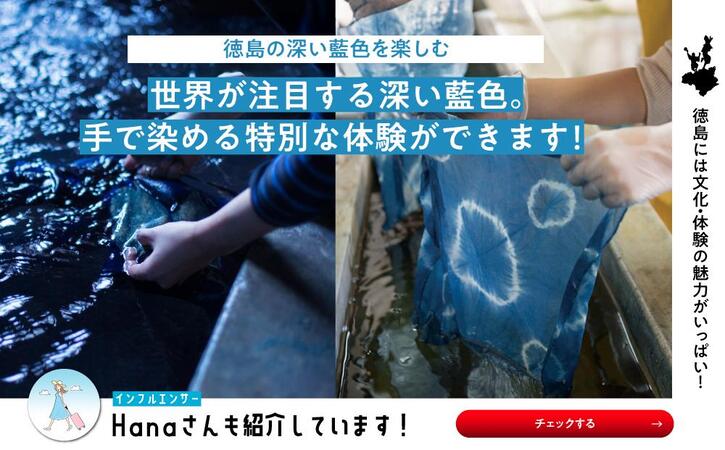 藍染め体験では、ハンカチやストール、Tシャツなどを、自分好みの模様に染め上げることができます。絞り方やたたみ方によって、世界にひとつだけのオリジナル作品が完成。お子さまから大人まで楽しめるので、ご家族連れやカップル、海外からの観光客にも大人気です。
