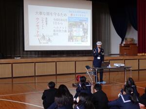 - 中学生や高校生は、通学などで自転車が日常の交通手段となり、交通事故の危険が格段に増えることから、映像や自転車実技教習を実施し、自転車の交通ルールの習得と危険予測・回避を指導しています。
