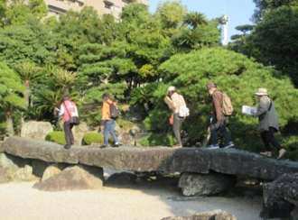 令和7年11月15日(土曜)第19回「図書館資料片手に街角散歩 徳島中央公園 ―お城と青石めぐり―」を開催しました。鷲の門を起点に、下乗橋→子供平和記念塔→旧徳島城表御殿庭園→バラ園というコースを巡りました。当日は快晴、紅葉も美しくまさに散歩日和となりました。