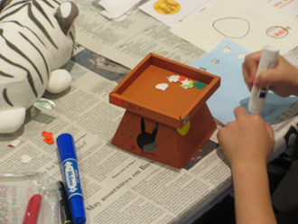 おだんごを載せる台を、おりがみやペンで飾りつけ!皆さん工夫して、個性あふれる飾りを作っていました。