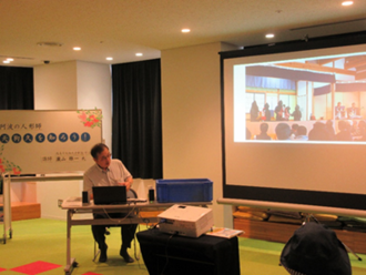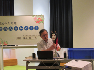 最初に、阿波人形浄瑠璃の歴史や特徴を紹介。農村舞台での春秋の上演が村人たちの楽しみであったことや、一体の人形を三人で動かす世界でも例がない仕組みや文楽人形との違いなどを、写真を使って説明してくださいました。