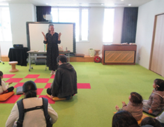 令和6年11月23日(土曜)、はこらいふ図書館5階おはなしのへやにて「ハッピー★イングリッシュ」を開催しました。講師は「マカファミリーイングリッシュ」として英語の講師をしているメアリー・マカさんです。ベビーの部とキッズの部の2部構成で行いました。ベビーとキッズ合わせて50名のかたにご参加いただきました。