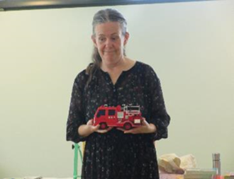 イベントが始まり、メアリーさんが笑顔で「hello」と歌い出すと、緊張していた子どもたちも楽しそうに真似をしていました。消防車の歌を歌う場面では、模型が登場!模型とジェスチャーを使って、ホースをつないだり、はしごを伸ばしたりする英語を教えてくださいました。