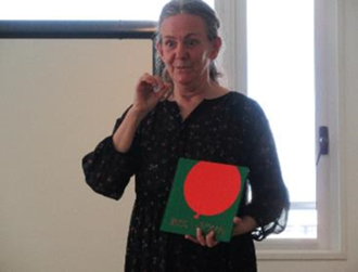 「あかいふうせん」の読み聞かせ。 風船(balloon)が変化すると…リンゴ(apple)に! 英語で優しく教えてくださいました。