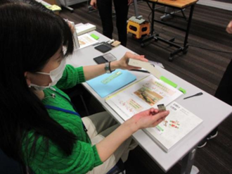 図書館に新しく入ってきた本に図書館名と受入日を表すためのハンコを押す体験では、新しい本に触れられることに歓喜されたり、ハンコを押すことに緊張されたりしながらも出来た時には「押した本に思い入れができますね」と仰っていました。