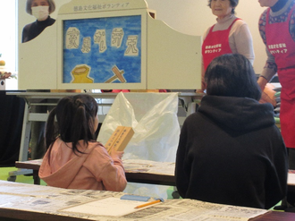 令和6年12月7日(土曜)、はこらいふ図書館5階おはなしのへやにて「おおがたかみしばいとこうさく」を行いました。講師は、「徳島文化福祉ボランティア」の皆さまです。お子さま3名、保護者のかた5名の合計8名のかたにご参加いただきました。