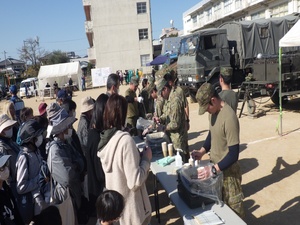 災害時の食事確保を目的として、自衛隊の炊き出し訓練と災害用備蓄食料(アルファ化米)等の配布訓練を実施しました。