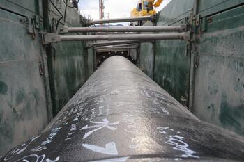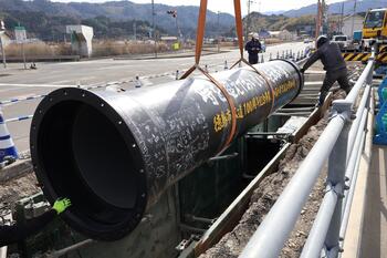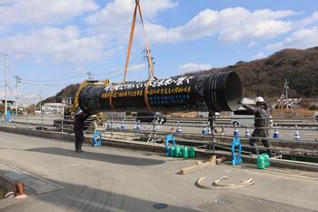 令和7年6月に開催した第十浄水場施設見学会で使用した「タイム水道管」を、令和8年1月28日、徳島市上八万町下中筋(上八万IC交差点付近)に布設しました。