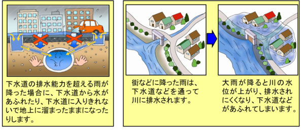降った雨を排水処理できず、建物や土地・道路が水に浸かってしまうことを内水氾濫と言います。外水氾濫と比べて、浸水規模は小さいですが、いたるところで発生しやすい特徴があります。