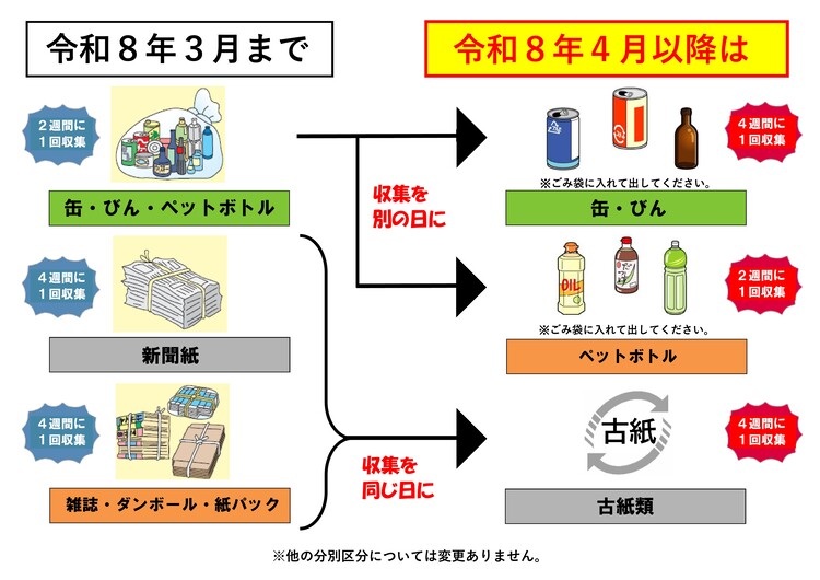 また、「新聞紙」、「雑誌・ダンボール・紙パック」の収集をまとめ、「古紙類」の収集となります。