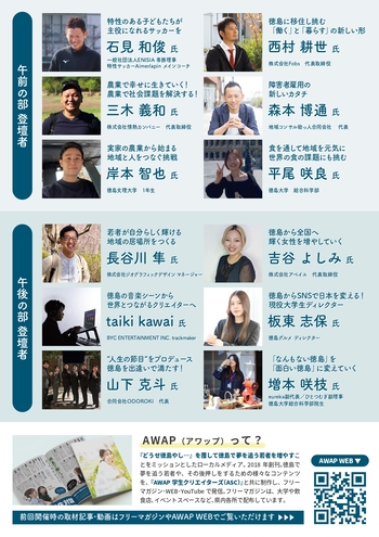 徳島市は、持続可能な地域づくりを推進していくため、市民活動団体などによる、まちづくり活動を支援しています。一般社団法人AWAPは、令和6年度の採択団体であり、フリーマガジンAWAPの発刊をはじめ、この度の「夢語りシンポジウム」の開催など、さまざまな活動を行っています。