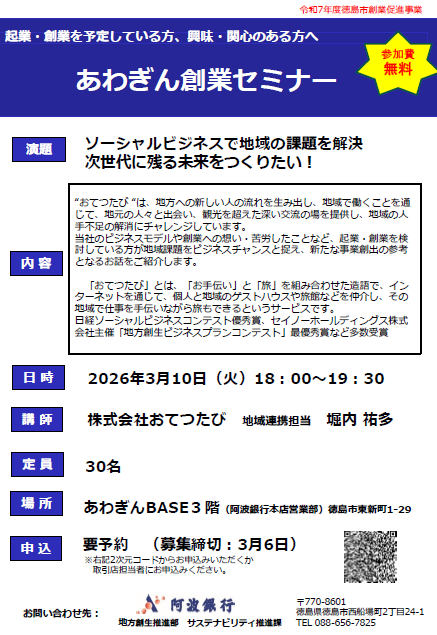 徳島市では、株式会社阿波銀行との連携により、創業予定の人や創業して間もない人、創業・起業に関心のある人への支援事業として、経営の具体化を目的としたセミナーを開催します。
