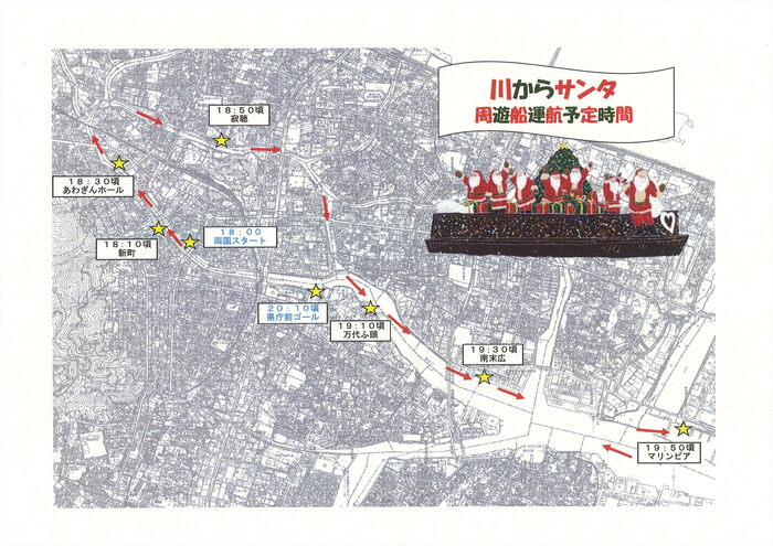 イルミネーションで彩られたひょうたん島周遊船に乗ったサンタクロースが、川の駅・停留所候補地の桟橋周辺8カ所を巡回し、各日各所先着100人の子どもたちにプレゼントを配布してくれます。