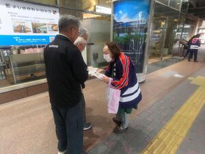 令和5年11月9日(木曜日)、秋季火災予防運動週間中の行事として、女性防火クラブ連合会会員がJR徳島駅前にて街頭防火広報を実施しました。JR徳島駅を利用される方などに、啓発用リーフレットを配布し住宅用火災警報器の設置促進と適正な維持管理を呼びかけました。