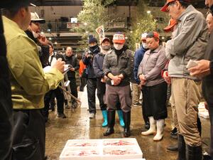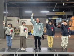 また、「こどもまんなか応援サポーター」である本市ならではの取り組みの一つとして、公募で選出された小学校5・6年生の児童4名が徳島市長と一緒にせり開始の合図を行い、鐘の音に導かれる威勢の良い掛け声とともに新年の初せりを迎えました。