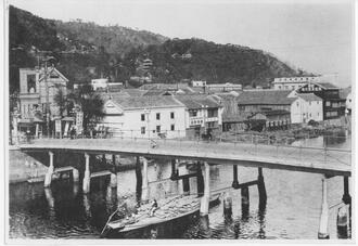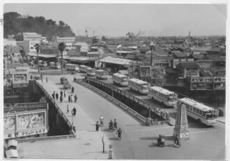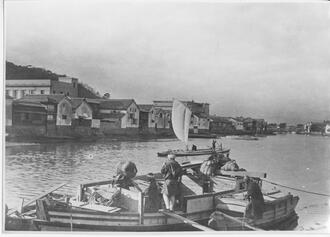 2 満潮にのせて橋の下を上荷船(うわにぶね)が上(のぼ)る(昭和10年ごろ) 上荷船とは本船と波止場との間を往復して荷物の積卸しをしている喫水の浅い船。