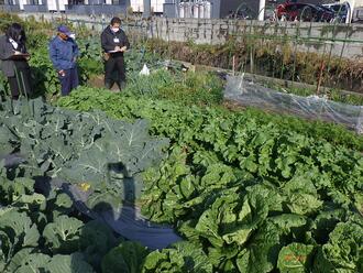 《ほ場審査の様子》菜園管理者の案内のもと、審査員2名で採点を行います。