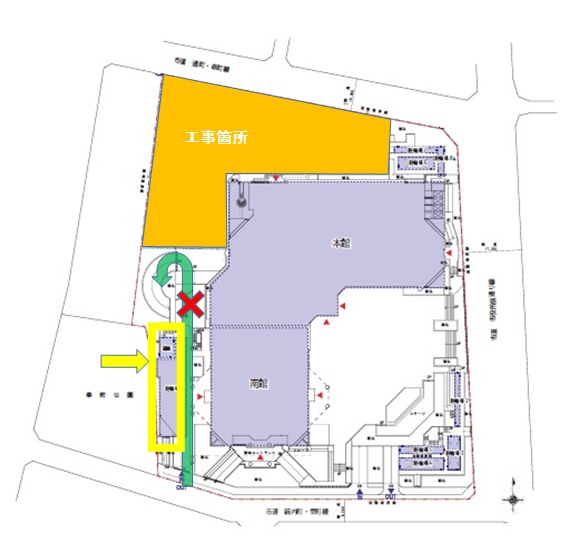 徳島市危機管理センター(仮称)新築工事に伴い、下記日程については、現在の進入路スロープ(下図緑色矢印)に入ることができなくなります。