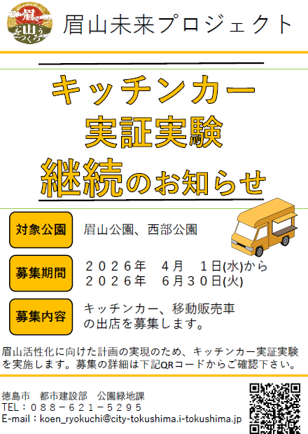 公園緑地課では令和7年4月1日から令和8年3月31日までの期間、眉山活性化に向けた「眉山未来プロジェクト」の一環として、眉山にキッチンカーを出店する実証実験を実施しておりましたが、令和8年4月1日以降も引き続き事業者の募集を継続します。なお、実証実験は試験的な試みのため、公園使用における利用ルールを一部緩和していますので、募集内容については、必要に応じて見直す場合があります。
