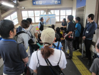 徳島駅にて従業員の皆さんからの説明のもと、時刻表の文字の色の違いや、列車が連結している部分の「切り離し」を見学しました。