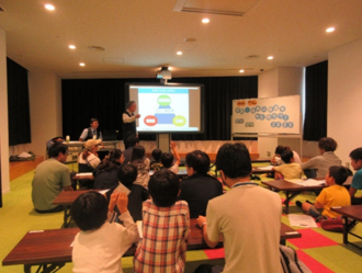 後半は、図書館5階おはなしのへやに移動。徳島駅長さんと従業員の方から資料やスライドを見ながらクイズや駅にあるいろいろな場所の説明をしていただきました。