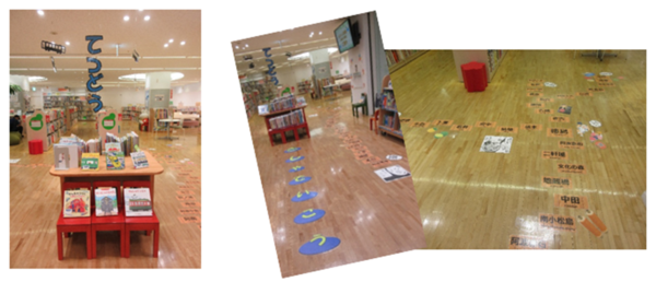 イベントに合わせて、図書館では「てつどう」の特集コーナーを設置。また、床には徳島県内の路線に見立てた飾りつけをしました。