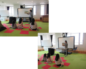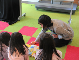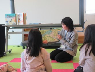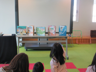 今回のテーマは「あわ」で、徳島の「あわ」、ぶくぶくの「あわ」、びっくりの「あわ あわ」など、いろいろな種類の本を紹介しました。「あわ」に関する本のお話の一部分だけを紹介したり、最後の結末だけを伝えずに絵本を読んだりして、本に興味を持ってもらえるようにお話をしました。徳島はかつて「阿波(あわ)の国」と呼ばれていました。阿波の国を流れる四国で一番大きな川「吉野川」の歴史について書かれた本の紹介をしました。他にも、身近な物を使って泡をつくり出す方法が書かれた本を紹介したり、びっくりする展開のお話を紹介したりして、みなさん楽しそうに本に興味を示している様子でした。